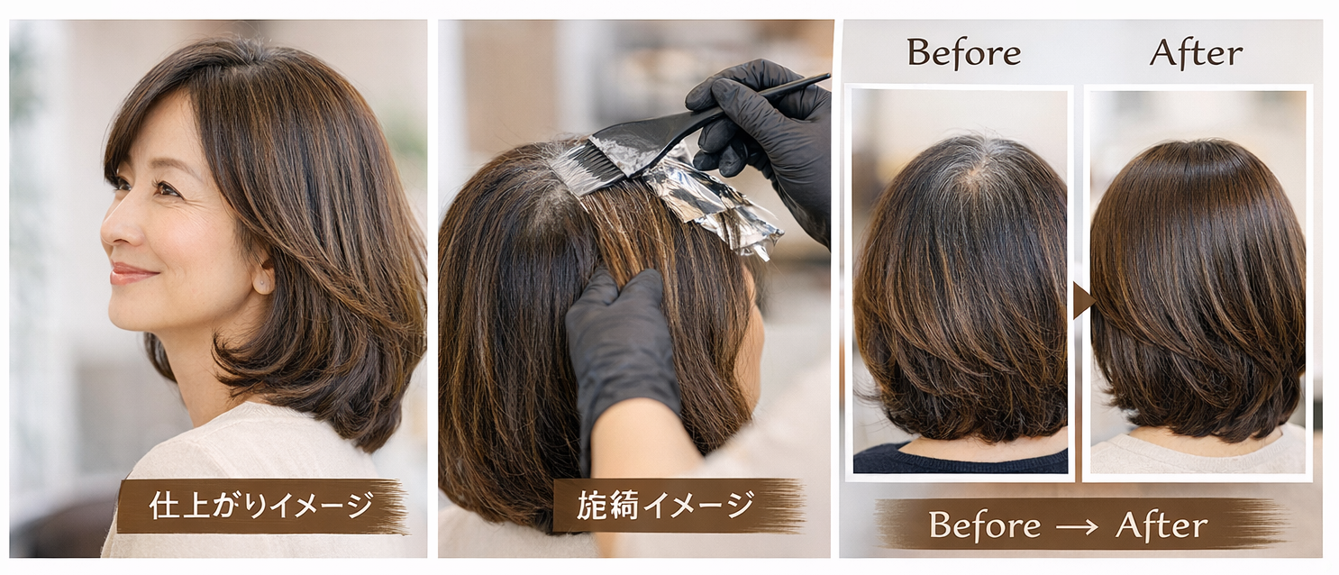 例えば➡ “明るめカラーで白髪をぼかす” “ハイライトを使って伸びても目立ちにくくする” “グレイヘアへの自然な移行を楽しむ”